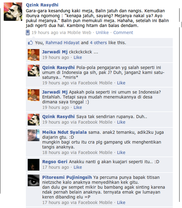Malas melewati jalan memutar seperti yang tiap hari saya lalui. Saat itu saya tergoda untuk mengambil jalan pintas menerobos pematang sawah yang sudah tidak pernah dilewati orang lagi. Jalan pematang itu berlumpur dan banyak ditumbuhi rerumputan berdaun tajam yang siap menggores kaki – kaki saya. Itu tidak mengurangi nafsu memintas yang menguasai sekujur badan.
