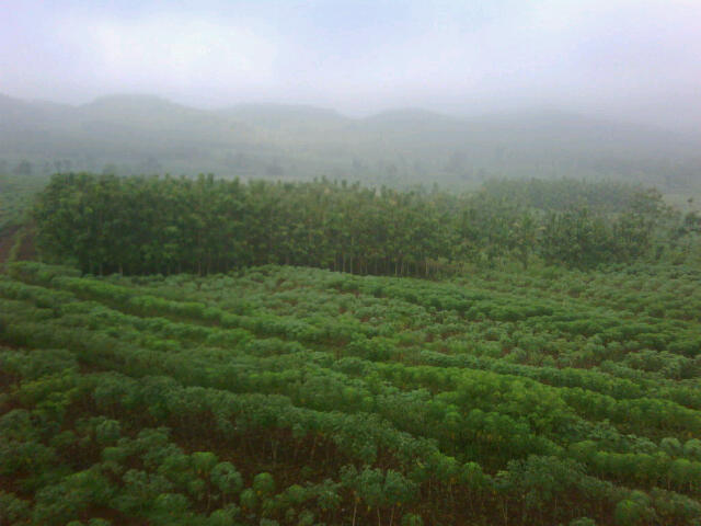 Pemandangan di kiri kanan sampai ujung lintasan jogging adalah hamparan pohon singkong yang daun – daunnya menghijau. Kelihatan sejuk. Dan menimbulkan suasana misty ditambah dengan warna putih kabut tipis yang menyelimuti bukit – bukit kejauhan. Sudah bulan Mei. Panen singkong, nggaplek, sebentar lagi.