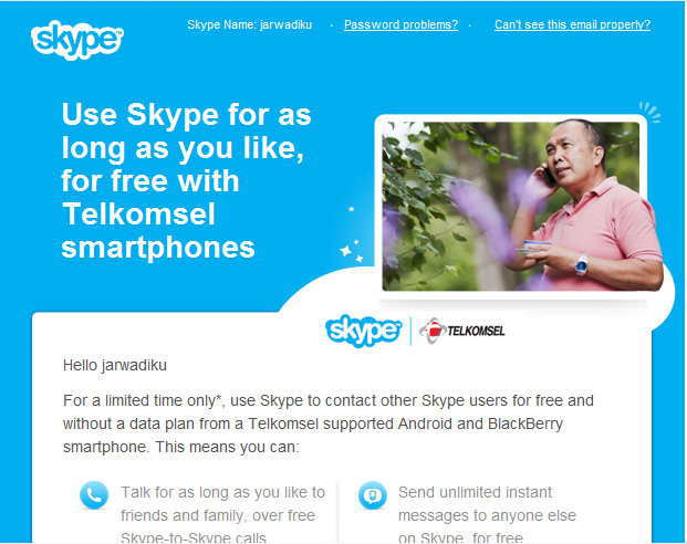 Kamis, 16 Februari lalu saya mendapatkan email promo dari skype. Promo ini rupanya adalah kerjasama dengan operator pelat merah, Telkomsel. Skype dan Telkomsel dalam promo ini menawarkan gratis biaya data sampai tanggal 29 Februari 2012 bagi pengguna skype yang meng-install aplikasi Skype mobile di perangkat Blackberry dan Android. Setelah lewat masa promo akan dikenakan biaya pemakaian data reguler atau bisa membeli paket data Skype dengan harga Rp 25.000,- per bulan untuk unlimited penggunaan Skype Telkomsel Mobile. Term of Service-nya bisa dibaca di sini.