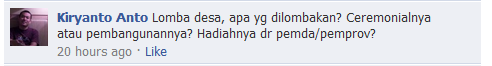 Dalam hal ini saya lihat yang menjadi permasalahan adalah format Lomba Desa yang digunakan yang sepintas dari kejauhan terlihat sebagai warisan saklek dari jaman Orde Baru. 😀
