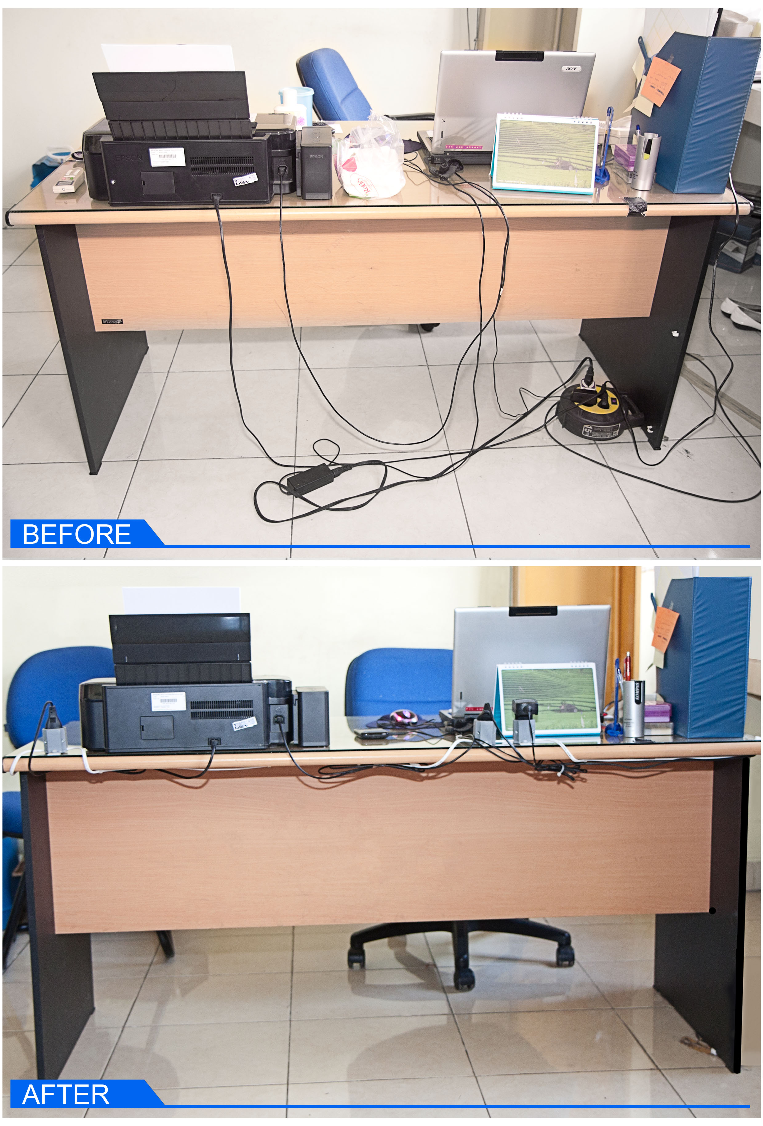 Sejujurnya saya juga menginginkan penataan jaringan dan colokan listrik baik di ruang kerja kami di kantor maupun di kamar saya sendiri. Dan sejujurnya pula bagi saya sendiri tidak cukup sabar dan terampil untuk mengambil tang, mengelupas kabel, mengencangkan sekrup, mengambil palu dan memasang klem dan baut untuk mengaitkan kabel dan stop kontak. Selain saya pikir paku dan palu akan merusak lantai atau bagian-bagian tertentu perlengkapan kantor seperti meja, almari arsip, skat, kabinet dan lain-lain.