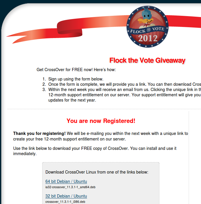 Sampai hari ini saya mendapati informasi di  CodeWeavers’ Flock The Vote promotional web site tentang tawaran gratis Cross Over bila di-download dalam 24 jam hari ini. Saya langsung mendaftarkan diri dan mendownload Cross Over untuk Debian baik versi 32 maupun 64 bit. Dan tentu saja sayang untuk melewatkan tidak mendownload installer untuk Mac. 😀