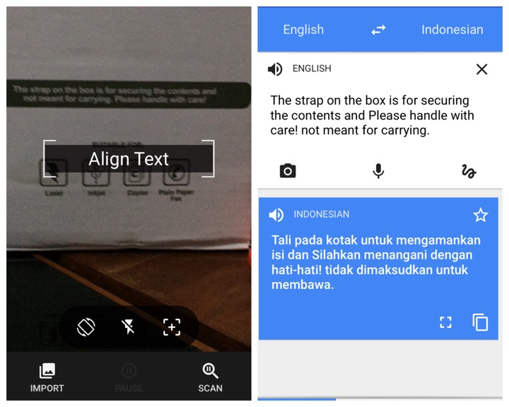 Pada percobaan kali ini saya mencoba Word Lens -nya Google Translate untuk menerjemahkan kalimat yang terdapat di karton di meja saya. Pencahayaan obyek dimana kalimat berada mengandalkan lampu neon, sementara koneksi internet ponsel menggunakan wifi. Hasilnya ini:
