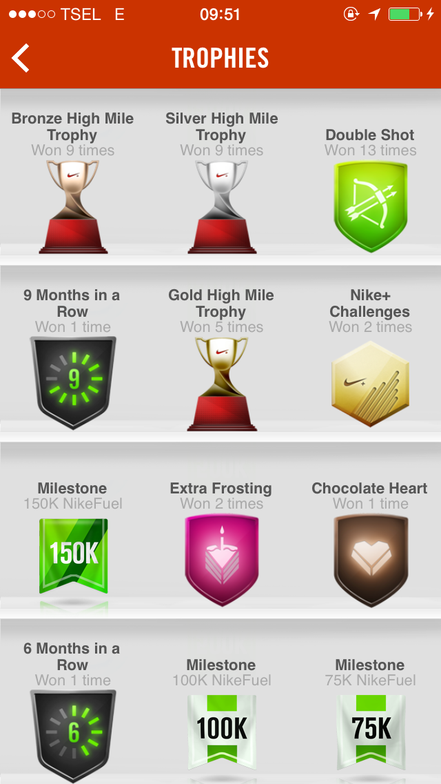 Pelari membangun kebanggaan pribadinya dengan mengoleksi finisher medal yang didapatkan ketika mengikuti race. Bagi pelari pemula seperti saya medal dan tropi telah disiapkan secara tersendiri. Mulanya saya dulu tidak begitu menganggap keberadaan tropi-tropi virtual ini. Melihat lintasan lari yang saya selesaikan, pace, akselerasi dan catatan waktu terasa lebih menyenangkan. Seiring berjalannya proses latihan, bahkan Chocolate Heart Badge ketika berlari di Hari Valentine dan Candle Badge ketika berlari di Hari Ulang Tahun pun menyenangkan. Saat ini saya sudah mengumpulkan 26 Badge/Medal/Tropi dari Nike Running Plus.