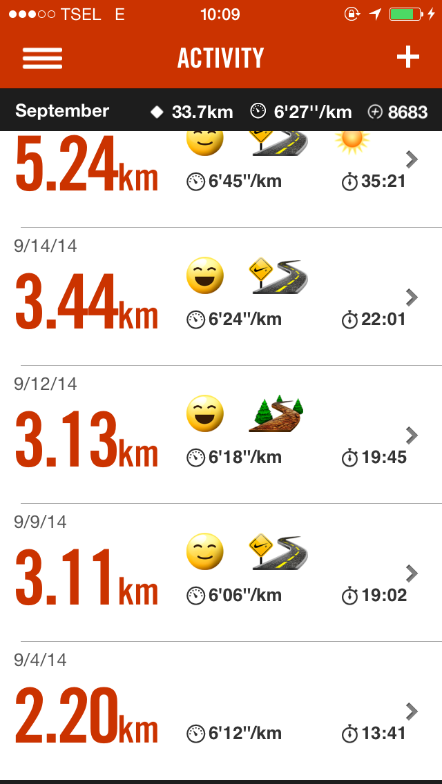 Cara lain saya untuk menemukan kebanggaan dan menyemangati diri adalah dengan melihat-lihat detil aktifitas lari pada awal-awal saya memulai lari kembali. Nampak pada tanggal 4 September 2014 saya baru mampu berlari sejauh 2,2 Km dalam waktu 13 menit 41 detik. Beberapa lari saya berikutnya pun saya tingkatkan sedikit demi sedikit.