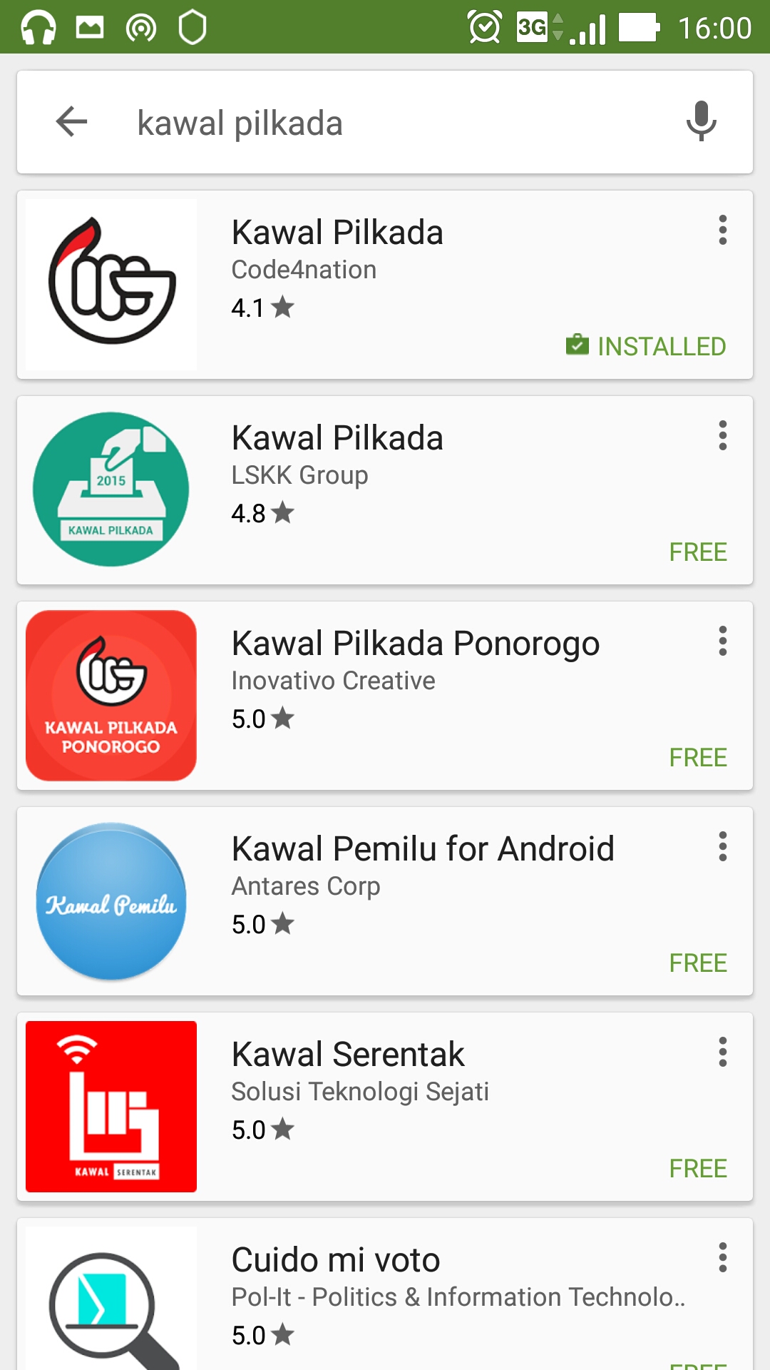 Untuk memasang Aplikasi Kawal Pilkada kita cukup mengetik Kawal Pilkada dan akan didapatkanlah aplikasi yang relevan. Pilih aplikasi dengan ikon seperti ditunjukkan oleh gambar di atas. Bergambar tangan mengepal dengan jari kelingking yang berwarna merah.
