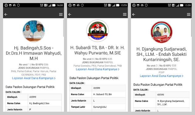 Apabila sampai hari ini kita belum tahu betul siapa saja Calon Kepala Daerah yang berlaga, aplikasi KawalPilkada menyediakan halaman profil masing-masing Calon Kepala Daerah. Dibawah ini saya screenshootkan 3 dari 4 Cakada di Kabupaten Gunungkidul.