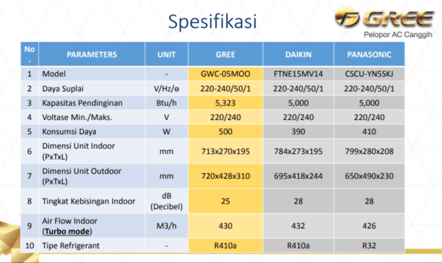 Bila sebelumnya saya mengutarakan fitur-fitur dan keunggulan AC Gree MOO Standard Series yang sesuai kebutuhan. Berikut ini merupakan perbandingan teknis AC Gree MOO Standard Series dengan beberapa merk dengan tipe yang setara.