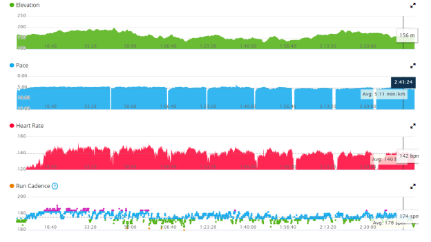 Long Run saya sejauh 32 km ini menghabiskan waktu sebanyak 2:46:06. Average pace 5:11 minutes/km. Average moving pace 5:04 minutes/km. Berhenti untuk minum dan mengguyur air menghabiskan waktu sekitar 3 menit.