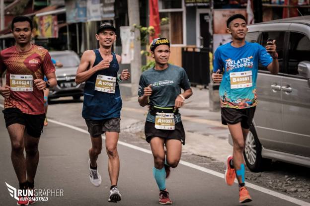 Beruntung saya bertemu Mas Jati yang membawa sebotol air mineral. Tanpa malu saya meminta Mas Jati untuk berbagi sebelum saya bergabung satu baris dengan pelari komunitas seperti Ary Iskandar, Fauzi Imdadur, Siti Muawamah dan lain-lain. Sebaris pula dengan Bara Kumbara, Margono dan sejumlah pelari elit.
