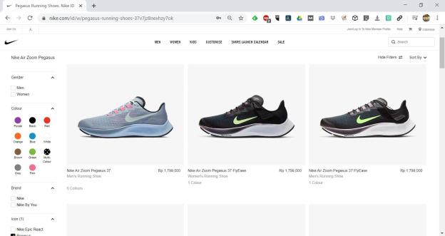 Saat ini Nike Air Zoom Pegasus 37 sudah bisa dibeli dari website Nike Indonesia di: https://www.nike.com/id/ Selain di website Nike saya belum tahu dimana saja sepatu ini sudah bisa dibeli. Saya pun penasaran apakah Pegasus 37 sudah bisa dibeli di toko – toko offline di mall – mall seperti di Nike Store.