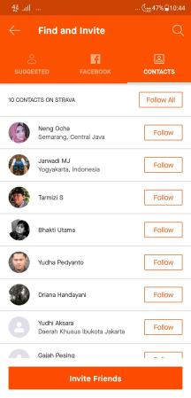 Bila kita memberikan permission kepada Strava untuk mengakses daftar kontak kita maka Strava akan menganalisis siapa saja teman-teman di daftar kontak kita yang telah menggunakan Strava dan menyodorkan fitur untuk mengajak teman-teman kita yang belum bergabung untuk bergabung ke dalam Strava.
