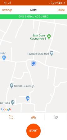 Jangan terburu-buru menekan tombol “START” ketika Strava menyodori kita halaman ini. Tunggu dulu sampai Strava mendapatkan sinyal GPS yang ditandai dengan tulisan “GPS SIGNAL ACQUIRED” berlatar belakang hijau di bagian atas layar smartphone. Sebelumnya di bagian layar ini akan berlatar warna biru yang berarti Strava masih dalam proses mendapatkan sinyal GPS yang mencukupi.