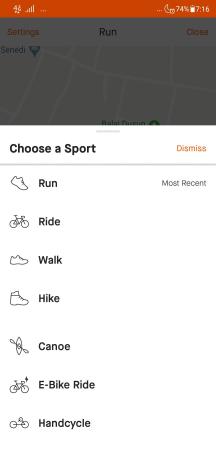 Persis di atas tombol “START” terdapat ikon olahraga yang sedang dipilih. Tekan ikon ini dan Strava akan menawarkan banyak pilihan olahraga seperti nampak dalam screenshot di atas. Karena kali ini kita akan mencoba olahraga lari maka kita harus memilih “Run”.