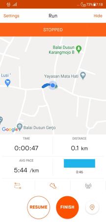 Tombol “Stop” berfungsi untuk menghentikan proses perekaman olahraga lari kita. Ketika tombol Stop ditekan maka Strava akan memberi kita dua pilihan. Pilihan pertama adalah Resume bila kita akan beristirahat sejenak untuk kemudian melanjutkan berolahraga. Tombol Finish berguna untuk mengakhiri olahraga lari kita.