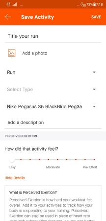 Select Run type bisa kita pilih apakah kita sedang berlari sebagai bagian dari workout, recovery, atau race. Kita juga bisa memasukkan nama sepatu yang kita gunakan. Ini kelak akan bermanfaat untuk mengetahui seberapa banyak km yang telah kita tempuh dengan suatu sepatu tertentu. Untuk kemudian memensiunkan sepatu bila telah mencapai km batas ambang.