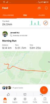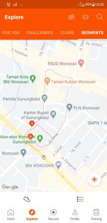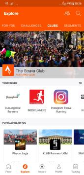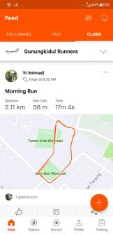 Menu Feed memiliki 3 tab, yaitu following: untuk melihat aktivitas olahraga teman-teman yang kita ikuti, you: untuk melihat log/rekaman olahraga kita, dan clubs untuk melihat aktivitas di dalam club-club yang saya ikuti. Dalam tangkapan layar paling kanan di atas kita melihat saya club Gunungkidul Runners yang saya ikuti.