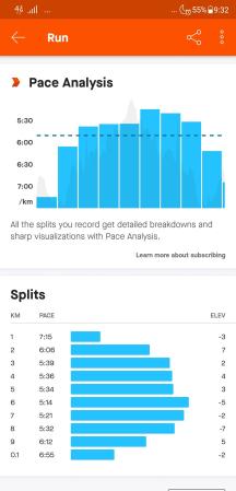 Strava memberikan analisis yang komprehensif terhadap olahraga lari kita sampai ke: pace split. Misalnya di km 1 kita berlari dengan pace berapa menit/km dan dengan elevasi berapa, berapa km 2, km 3, sampai kita finish.