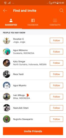 Halaman Find Friends menyodorkan 3 tab yang masing-masing adalah: Suggested (daftar orang yang disarankan untuk kita jadikan teman berdasarkan algoritma Strava), Facebook (berisi daftar teman-teman kita di Facebook yang telah bergabung dengan Strava, dan Contact.