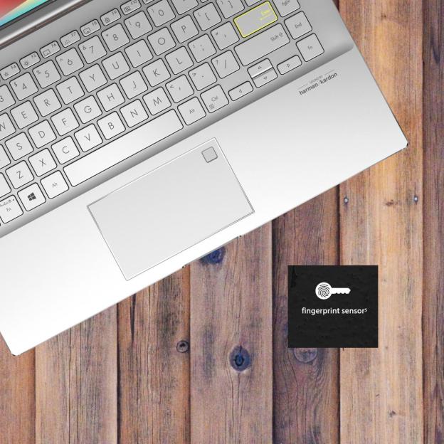 Untuk melengkapi login dengan password atau PIN, VivoBook S14 memasang sensor sidik jari yang diletakkan di bidang touch pad. Terletak menyatu dengan touchpad membuat sensor ini mudah diakses secara cepat tanpa memerlukan jari tangan pengguna untuk bergerak dari satu tombol di satu bagian laptop ke bagian lainnya.