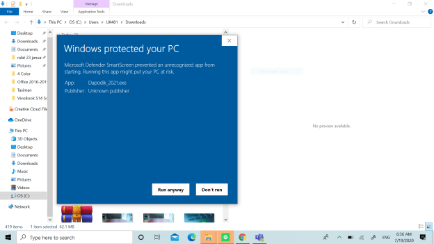 Windows 10 tidak akan menjalankan proses pemasangan aplikasi Dapodikdasmen 2020 secara otomatis. Sistem Operasi akan mengkonfirmasi apakah kita yakin bahwa aplikasi aman dijalankan di Windows 10. Pilih “Run anyway”.