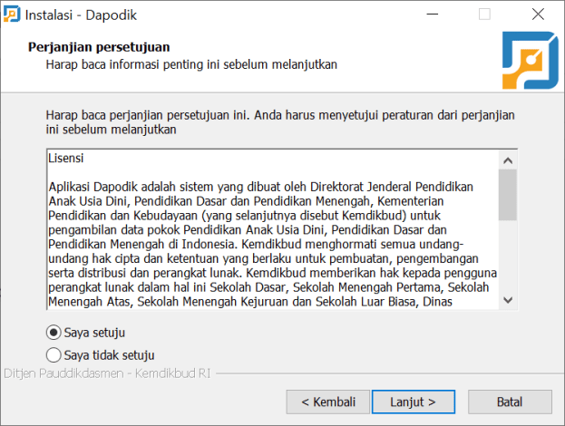 Di halaman Persetujuan Perjanjian, pilih “Saya Setuju” dan klik tombol “Lanjut>”. Proses instalasi dengan demikian akan segera berjalan.