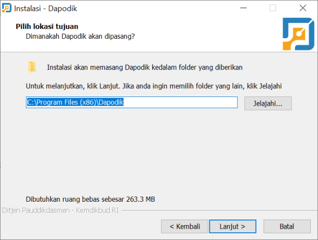 Pada halaman ini kita tidak perlu mengubah folder dimana aplikasi Dapodikdasmen 2021 akan dipasang. Langsung klik saja tombol “Lanjut>”.