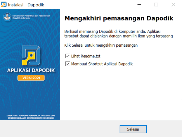Halaman ini menandai proses instalasi aplikasi Dapodikdasmen 2021 telah selesai.