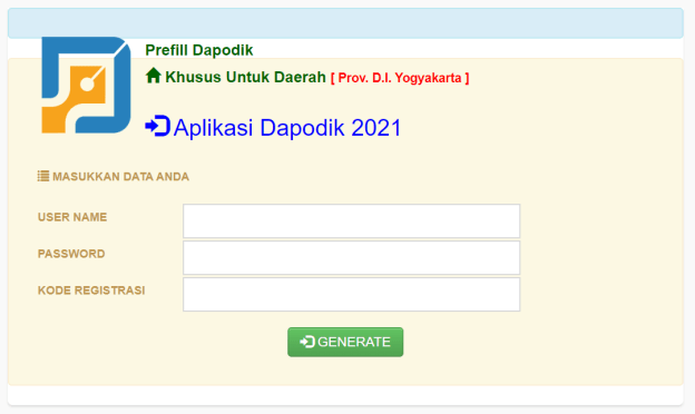 Di halaman ini isikan terlebih dahulu: Username, Password, dan Kode Registrasi. Bila data-data sudah dipastikan dimasukkan dengan benar, tekan tombol “GENERATE”.