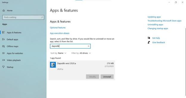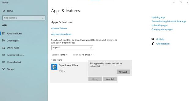 Cari “Dapodik versi 2020.a”, dan klik “Uninstall”