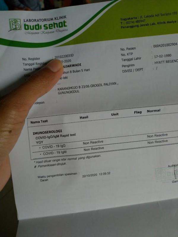Rapid test yang dilakukan di Lab Budi Sehat di Jalan Laksda Adisucipto Yogyakarta mengingat kapasitas rapid test di Hyatt Regency yang terbatas.