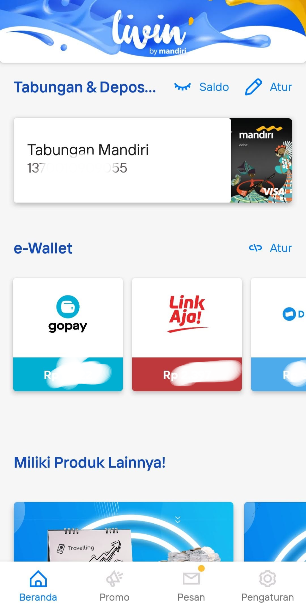 Ada fitur atau menu baru yang langsung nampak begitu proses login selesai. Fitur itu adalah e-wallet. Ada beberapa e-wallet yang didukung oleh aplikasi Livin by Mandiri warna kuning ini. Yang paling sering saya gunakan adalah Go-Pay dan Link. Sementara Dana dan Ovo saya sudah lupa. Untungnya saya memasang Livin by Mandiri warna kuning sehingga saya teringatkan dan mencoba mengingat ingat kembali PIN untuk login. Akhirnya ke-empat e-wallet saya pun kini bisa terkoneksi dan nampaknya untuk men-top up nya pun kian mudah.