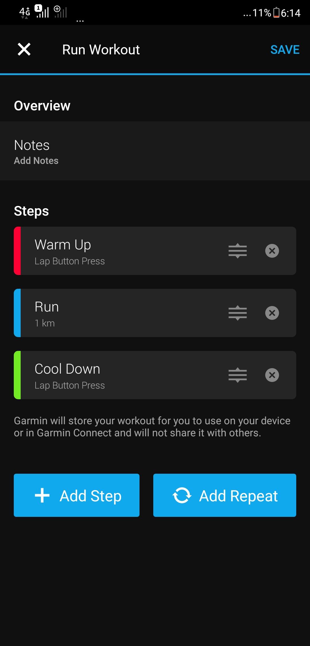 Di aplikasi Garmin Connect pilih Training => Workout => Run sampai muncul tampilan seperti di bawah: