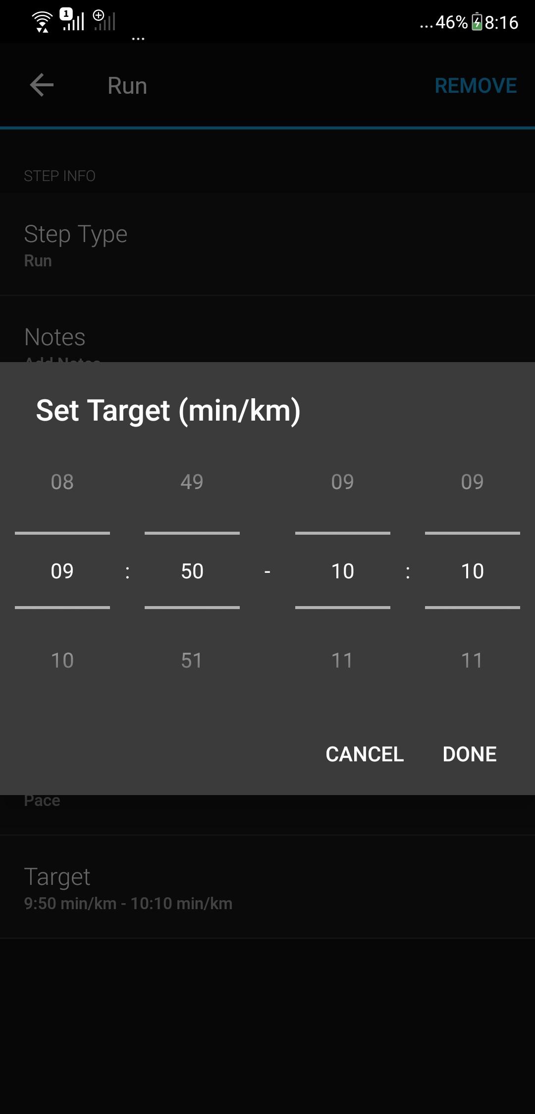 Pada opsi Intensity pilih Pace (/km). Atur target pace menjadi antara 9’55”-10’05”. Kenapa tidak dipilih 10’00”? Karena amat sulit untuk berlari terus menerus di pace 10’00”. Target pace ini bisa disesuaikan dengan selera, misal diubah menjadi 9’45”-10’15”, dan sebagainya.