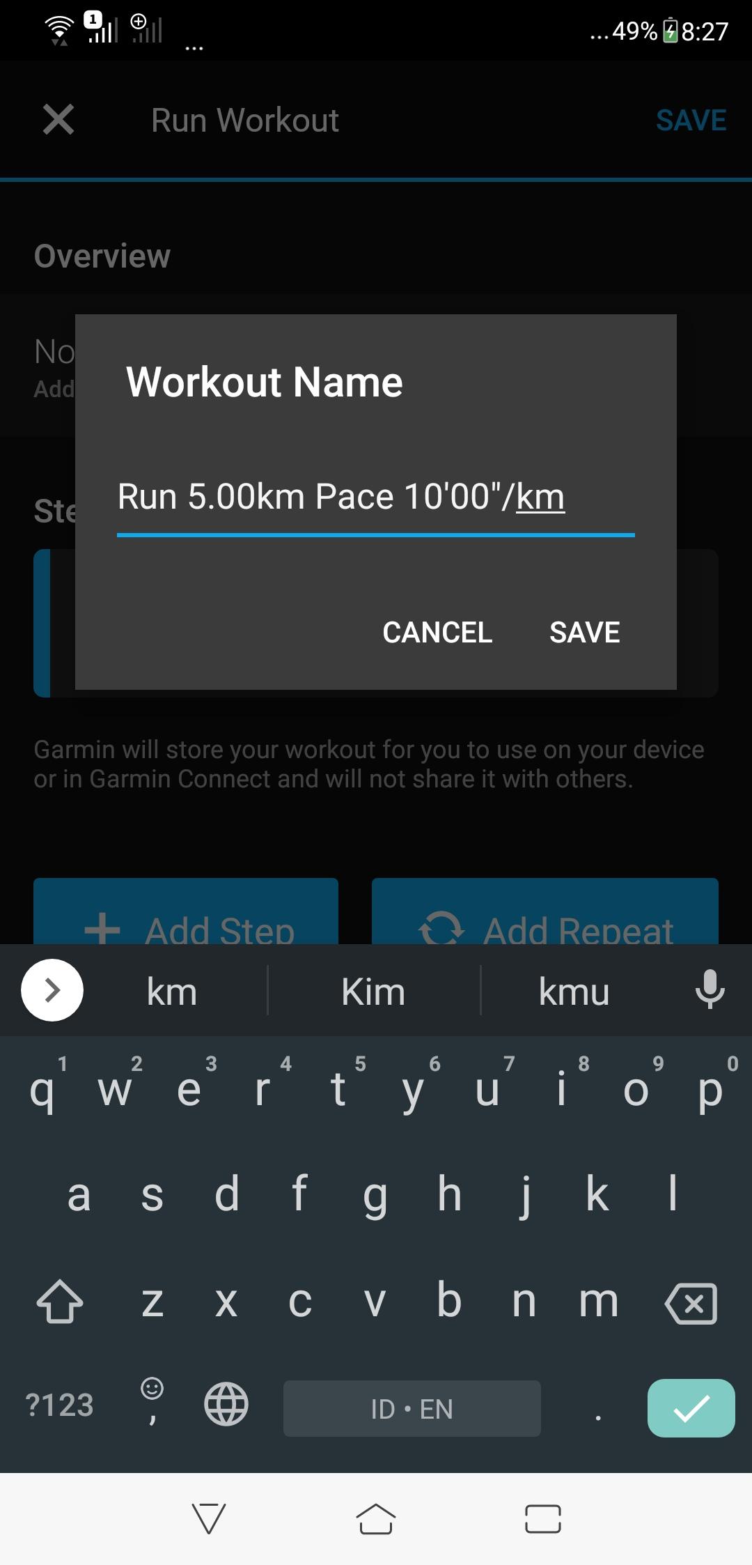 Bila semua parameter dan kriteria sudah diatur sesuai seperti di atas, kini saatnya untuk menyimpannya. Sebelum menyimpan aplikasi Garmin Connect akan meminta kita untuk memberi nama jenis Workout ini: