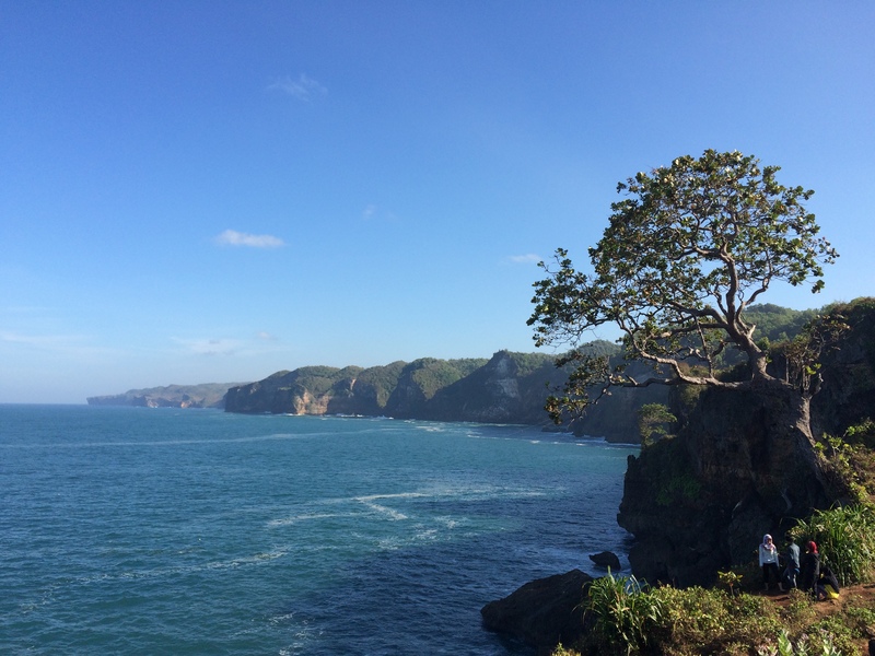 Sendirian berdiri di bibir tebing menghadap laut selatan membuat saya hanya bisa melongo, diam, takjub, merasa kecil dan terkadang seolah ada sepi menghampiri. Iya, sepi itu kadang-kadang di sini menjadi nyata. Pada saat yang tidak begitu beda ada rasa damai, bahagia dan rasa syukur yang entah datang darimana. Mungkin itu dibawa matahari pagi yang beranjak meninggi dengan hangat yang diterpakan ke sisi wajah saya. Mungkin dari semilir angin yang kadang membelai, kadang menampar. Atau mungkin mereka bawa bersamaan. Atau mungkin dibawa entah. Subhanallah …