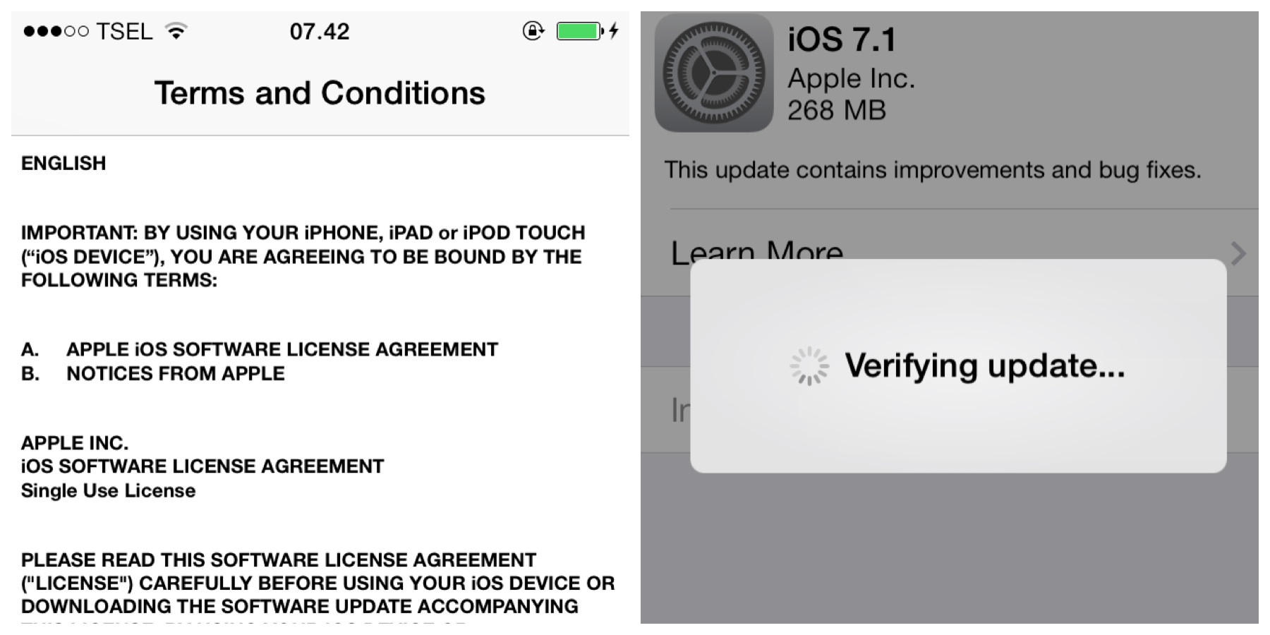 Untuk upgrade OS ini saya tidak melakukannya secara OTA (over the air). Saya memilih memanfaatkan bantuan iTunes. Karena meski dari info upgrade di iPhone menunjukan perlu mendownload file sebesar 1.2 GB saja, tetap saja diperlukan free space selega 5 GB -an di iPhone. Saya tahu ini karena sebelumnya saya search “iOS 8” di twitter sebelumnya. π Saran saya bagi yang baru akan melakukan upgrade, gunakan saja bantuan iTunes. Ini sangat membantu bagi pemilik iPhone yang memory internalnya 16 GB dan males menghapus-hapus konten. Bagi pemilik iPhone 32 GB ke atas dengan memory yang lega melakukannya secara OTA saya kira tidak masalah.