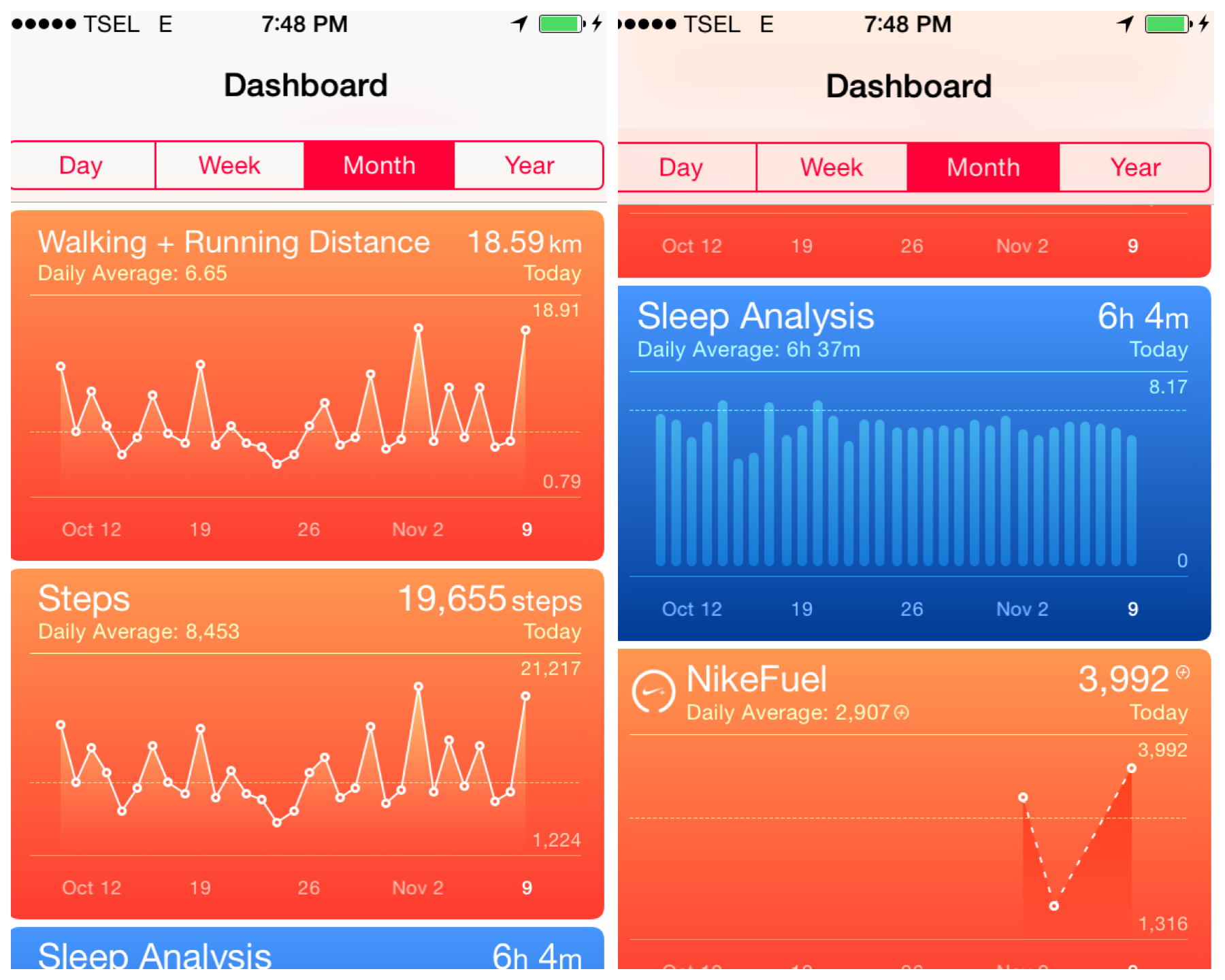 Aplikasi yang pertama kali saya coba adalah Health.Β Begitu aplikasi Health terbuka, saya tidak punya ide tentang apa saja yang ditampilkan aplikasi ini. Saya hanya melihat-lihat setting dan menu tanpa tahu pasti apa yang perlu saya lakukan, hehe. Hal yang bisa saya lakukan sebatas memasukkan data tinggi badan, berat badan, jenis kelamin, tanggal lahir dan jenis golongan darah. Pagi ini, selangΒ sehari saya menggunakan iOS 8, yang sudah bisa saya baca di Health adalah seberapa jauh saya sudah berjalan dari kemarin siang sampai pagi ini. Tentu ini jarak berjalan yang diukur ketika saya membawa iPhone.