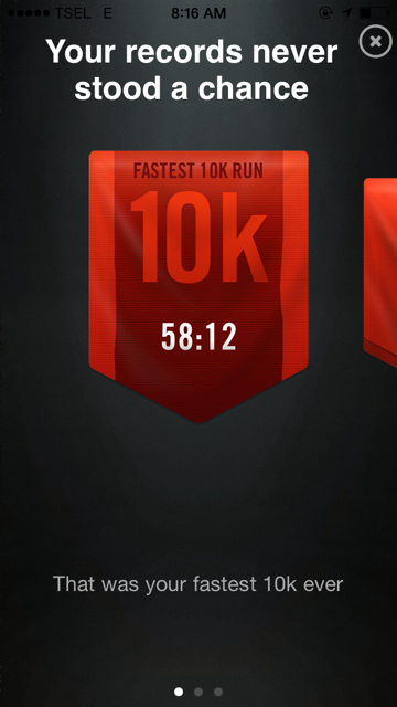 Sadar bahwa itu berpotensi membawa eskalasi kerusakan yang luas bagi kesehatan, sorenya saya tebus, saya imbangi dengan olah raga. Karena olah raga favorit saya adalah lari, maka saya pun berlari sejauh 5km. Seperti yang screen shot aplikasi pendukung running saya, Nike Running+ saya tampilkan di atas.